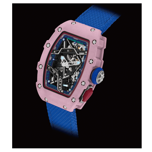 たとえば、ケースやムーブメントに使用されているスプラインネジは、数ヶ月に及ぶ開発と膨大な投資によりひとつのネジの製作には20以上の工程が必要です。また、グレード5チタンやARCAP合金、カーボンTPTⓇやセラミックスなど加工の難しいハイテク素材もふんだんに使用しています。リシャール・ミルのインスピレーションは、レーシングカーと耐衝撃性能を追求した研究から、地板の剛性、摩擦の軽減、耐衝撃性を大幅に改良され、不要な装飾は一切排除しています。見た目の美しさも重視していますが、機能を最優先にしています。そして、現状に新しい活力を注入すべく、女性コレクションを新しいステージへと引き上げるために、数々の技術的困難を克服し、既成概念を打ち破る多彩でユニークかつ現代的なレディススタイルも生み出しています。