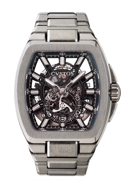 サファイアクリスタルのケースの裏側から複雑な時計の機構を眺めることができ、またスケルトンのダイヤル部分からも時計の精巧なムーブメントの細部を見せてくれます。こうした湾曲したケースにおいては、大変むずかしいとされる100m防水もクストスの高度な技術により可能にし、さらに視認性を追求し、エレガントな針の動きが鮮明に見えるよう設計されています。